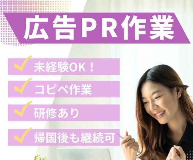 心優しい方 批判しない方 やる気のある方! 今からしっかり稼いで、 自由なライフスタイルを手に入れたい ■仕事内容 求人サイトやSNSへの広告投稿業務、画像加工や動画編集、WEBサイトやSNSを利用したマーケティング、各種セミナー運営補佐、Googleフォームへの入力作業など ■環境について ・初心者の方でもスムーズに作業ができるよう動画を使ったマニュアルを用意しています。 ・わからない点はすぐに聞けるようにチーム体制を整えているので未経験者でも安心してお仕事できます。 ■勤務場所 ・基本的にどこにいても対応可能です。 ■イベント ・年に2回大きな会場でイベントが実施されています ※自由参加です ■勤務時間 ご自身で自由に時間を決めることができます。 1日1時間〜でも可能! サブワークとして取り組まれる方も多く、本業の通勤時間・お昼休みの時間、就寝前の時間を活用してスキマ時間を確保している方がほとんどです! 時間に制限はなくご自身でスケジュールを組んで行なっていただきます。 ■報酬 完全成果報酬型 ■お仕事開始までの流れ アンケート審査 ↓ LINE説明会 ↓ 個別ヒアリング ↓ お仕事開始 【応募方法】 説明会へはURLより【全部読みました】とご連絡下さい!